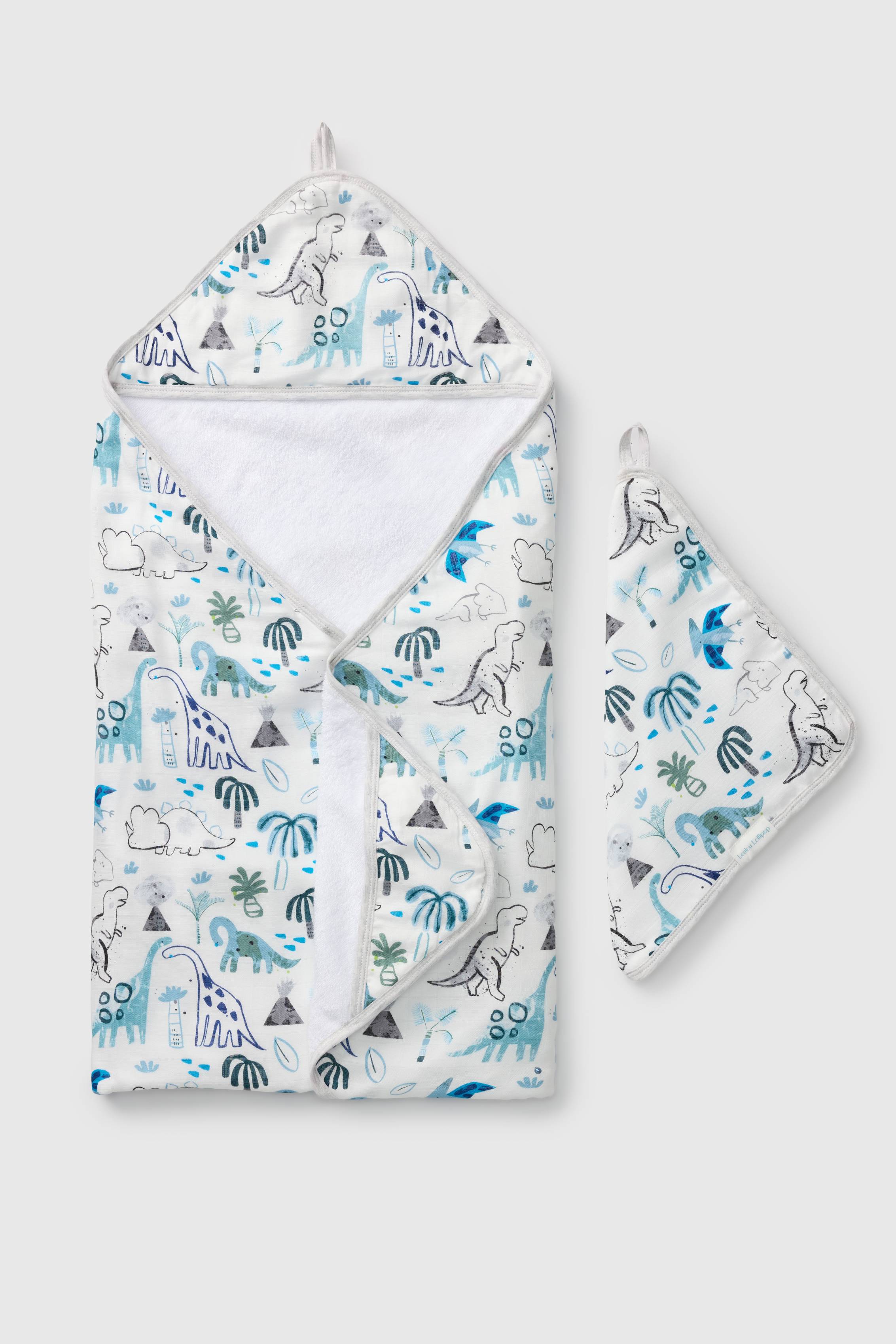 Hooded towel measures 32" x 32", and washcloth measures 12" x 12".