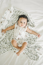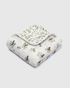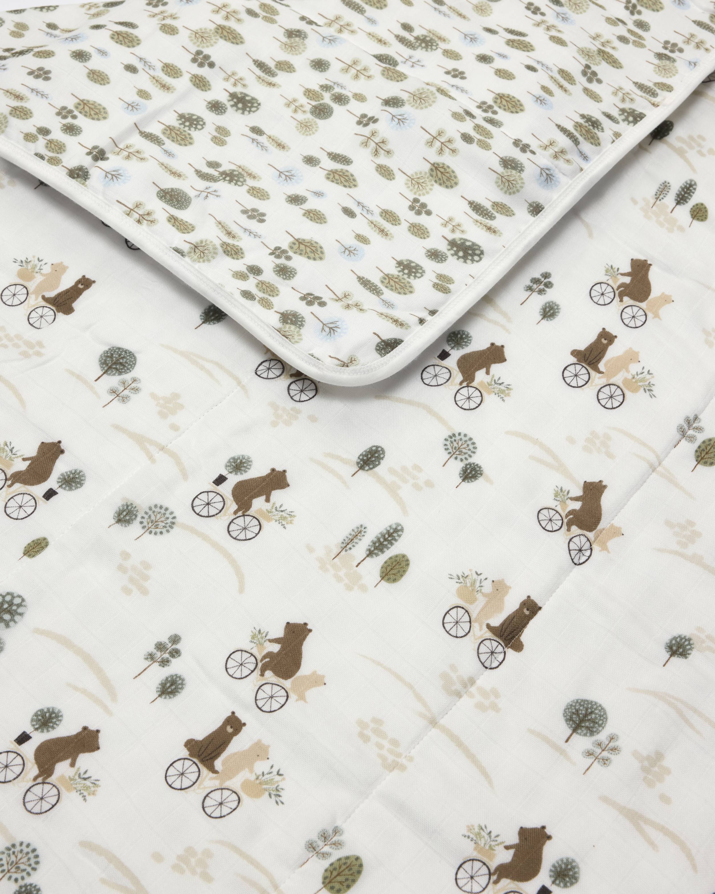 Our muslin quilts made from four layers of bamboo and cotton muslin fabric offer the perfect amount of breathable warmth and coziness to keep the baby comfortable and relaxed. This large reversible blanket is lightly quilted and features hand-drawn watercolor prints.