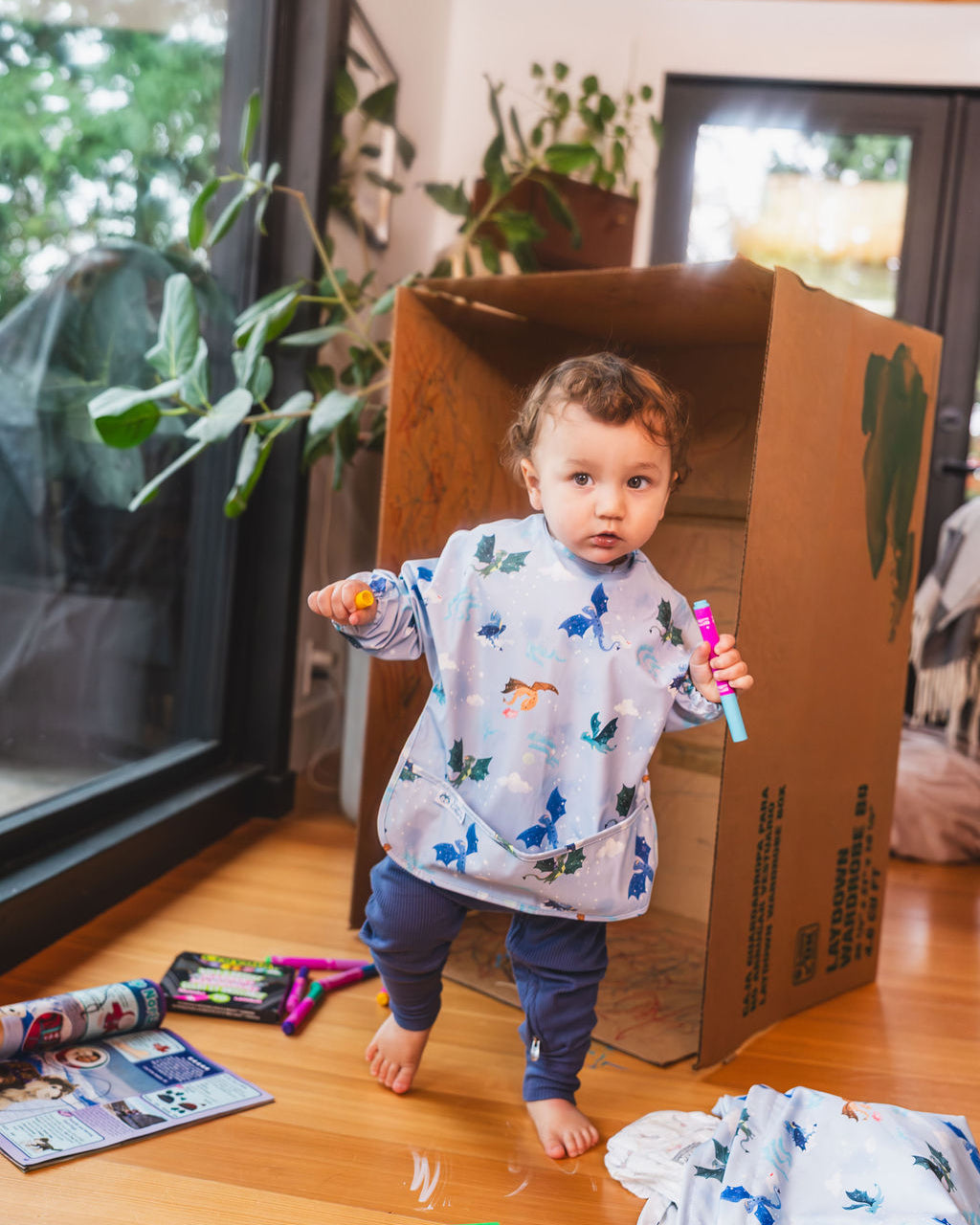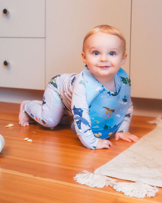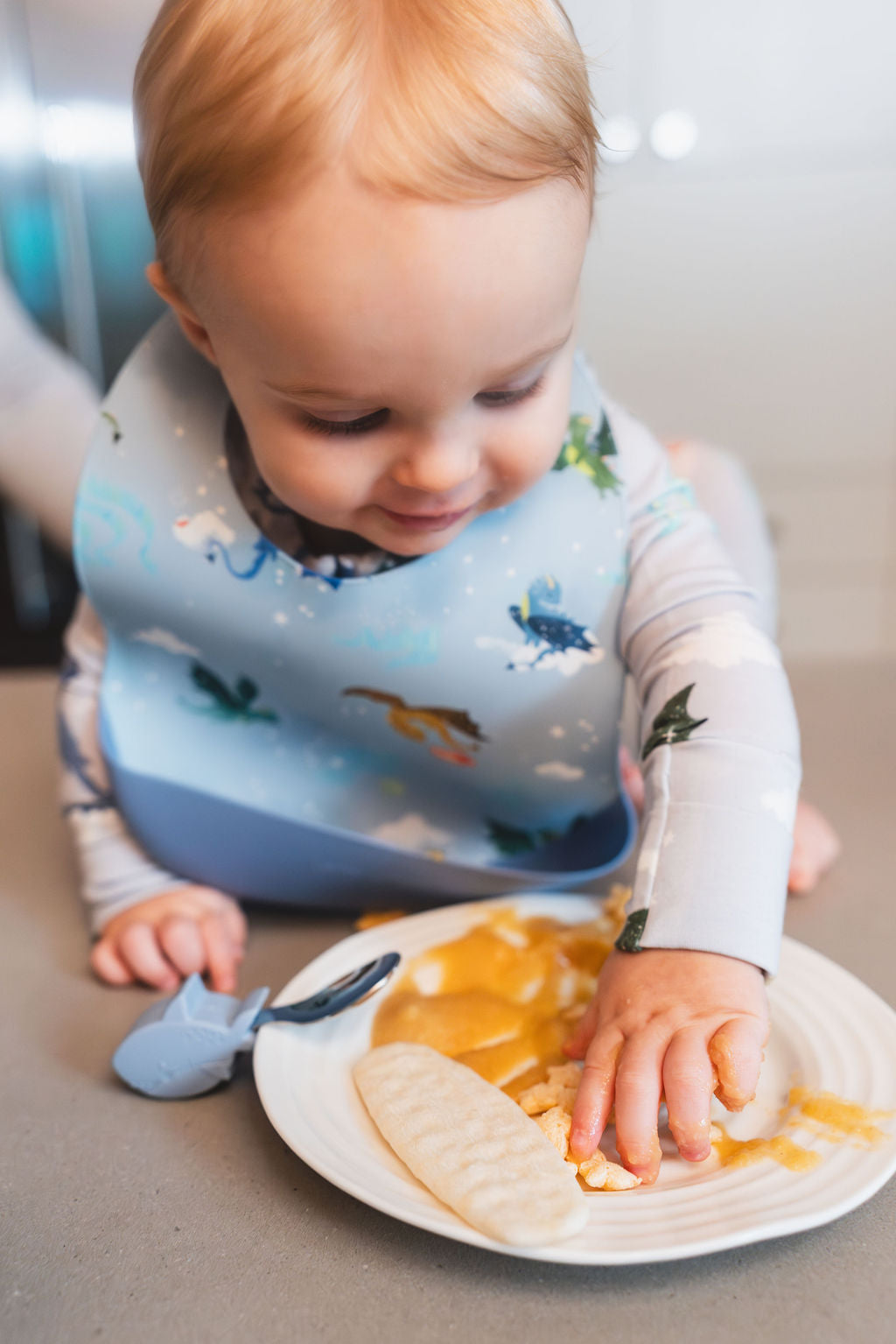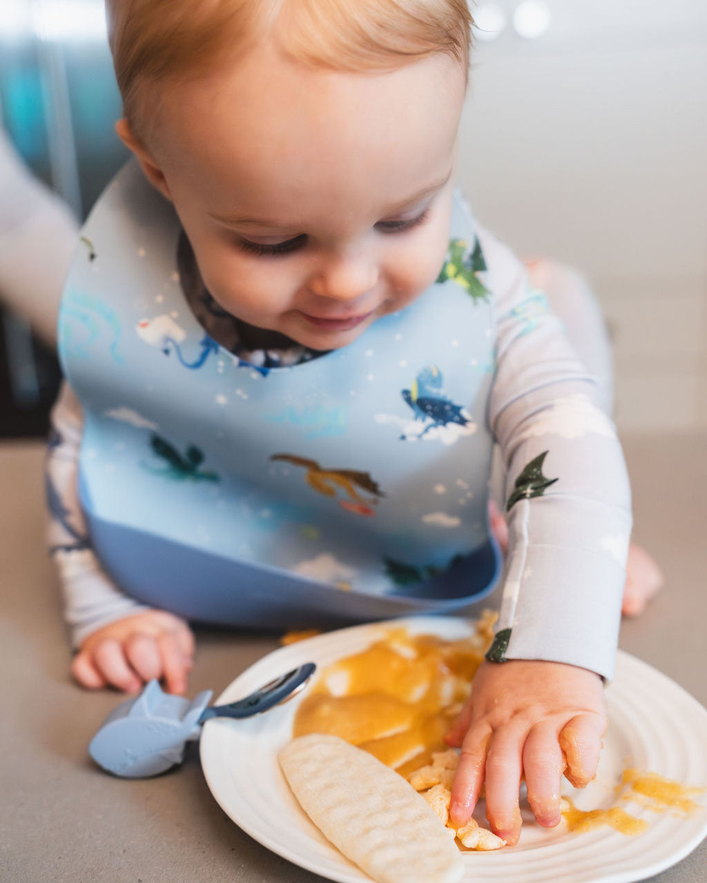 Unlike other bibs, its pouch sits below the highchair tray—perfect for spills