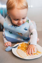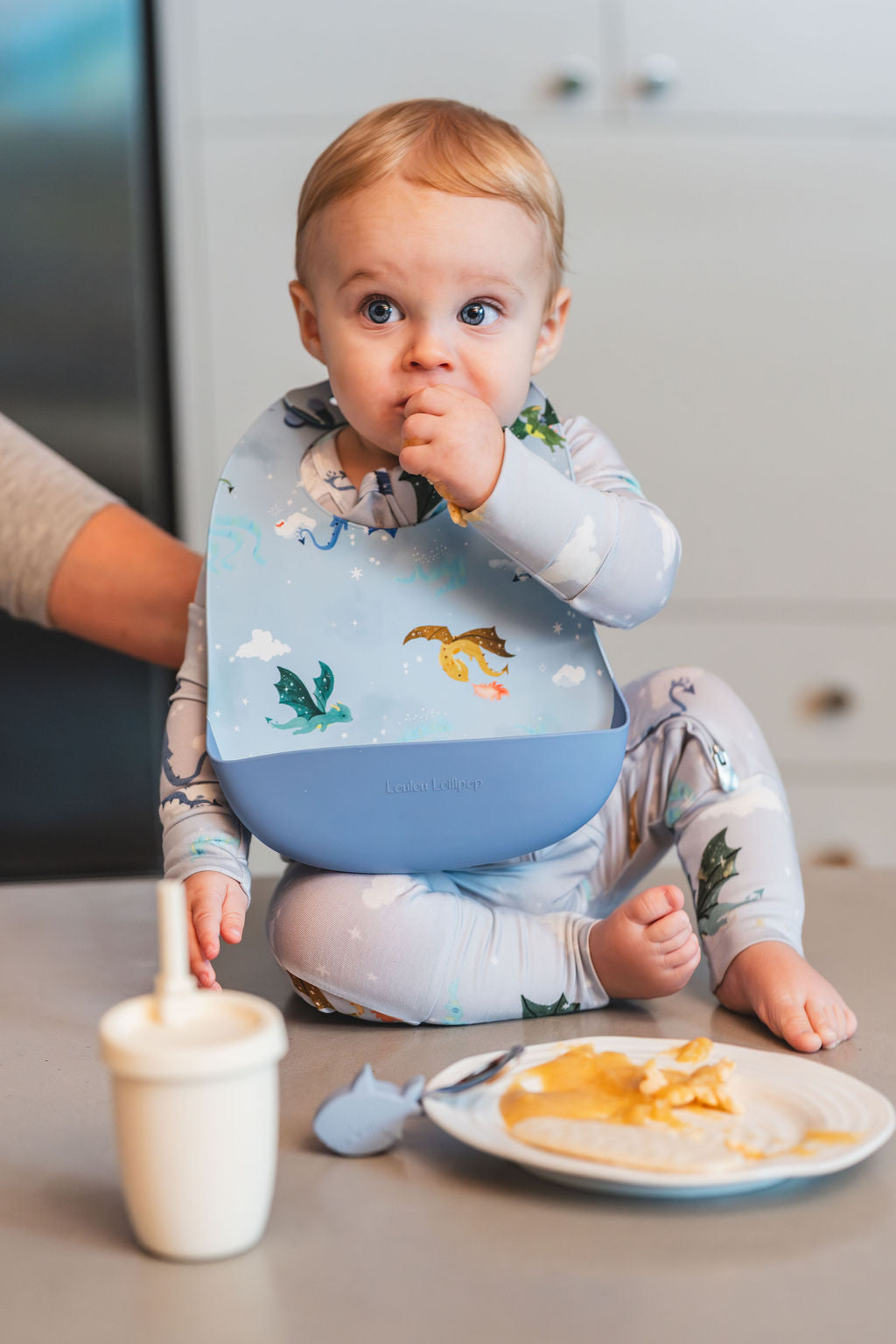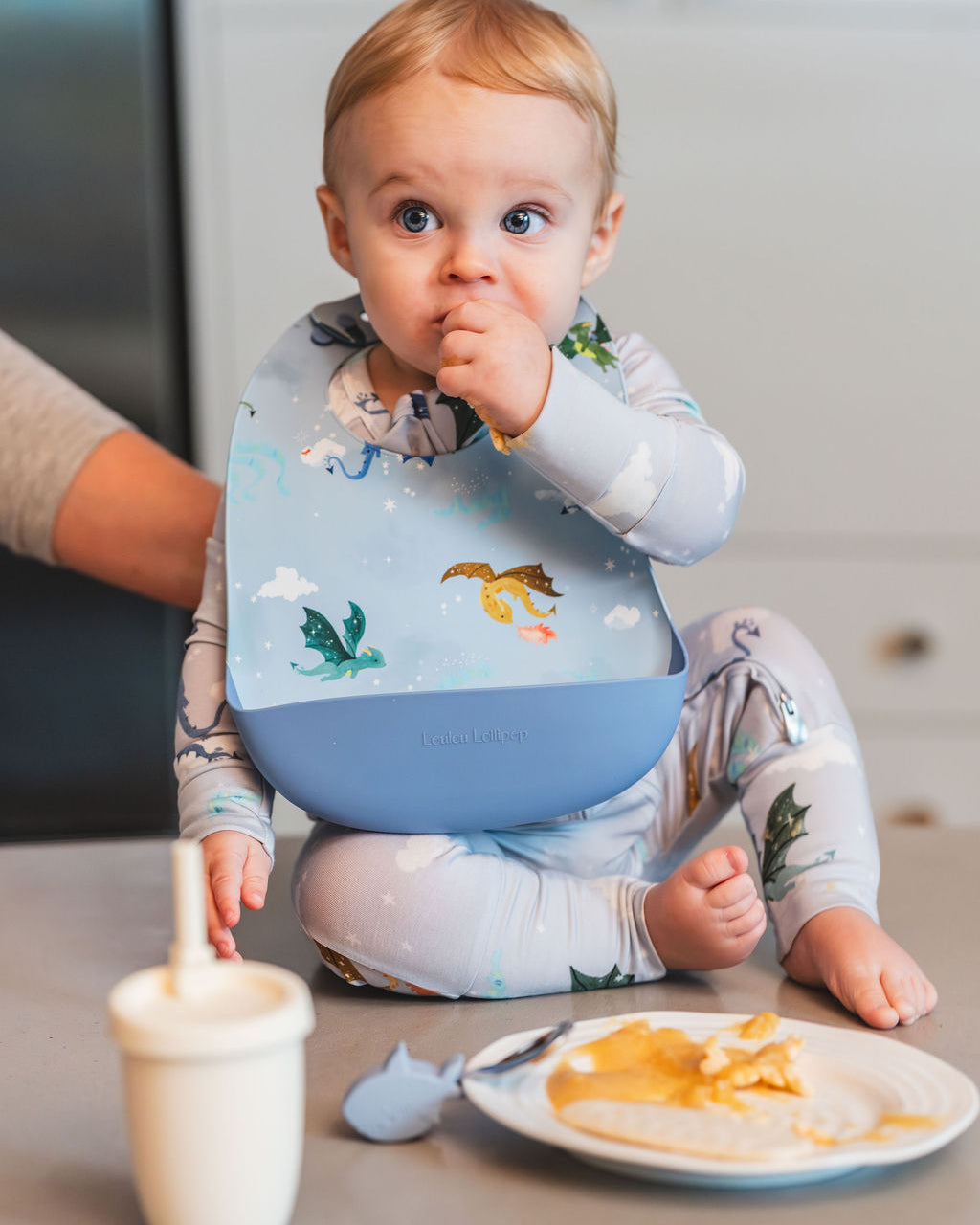 Our silicone bibs are buttery, soft, waterproof, and stain-resistant. It is easy to clean; simply wipe it down for a quick cleaning or put it in the top rack dishwasher for a deep clean. It features a wide catch-all pouch below a high chair tray – perfect for collecting food, crumbs, and spills. Reinforced buttonholes for a durable and adjustable fit for long-lasting wear, suitable for ages 3 - 36 months. This handy bib is available in various modern colors and fresh designs to make mealtime fun.