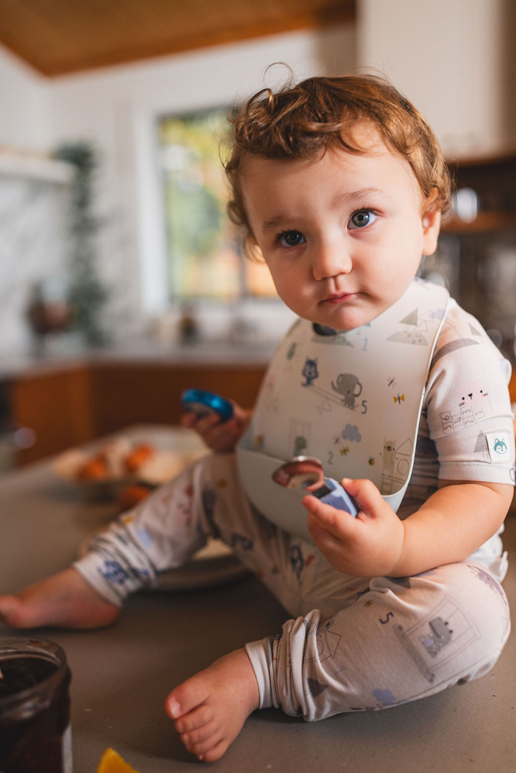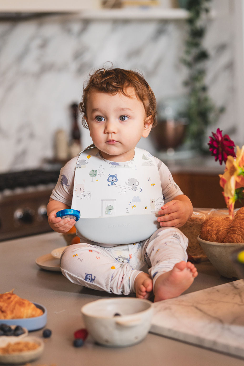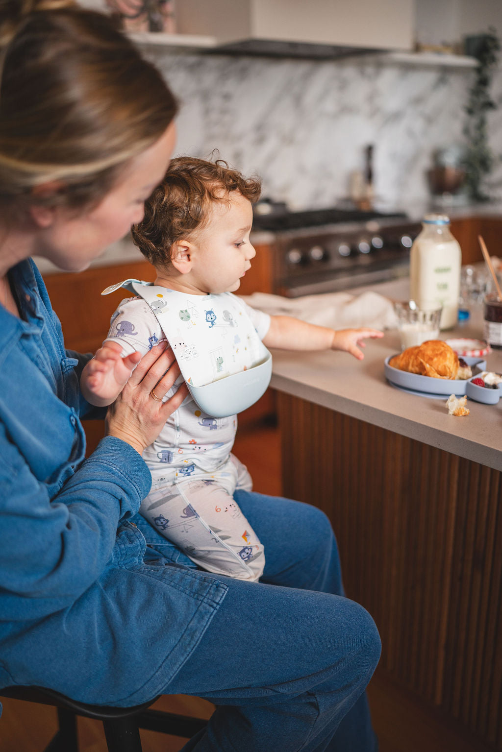 Unlike other bibs, its pouch sits below the highchair tray—perfect for spills