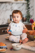 Our silicone bibs are buttery soft, waterproof, and stain-resistant. It is easy to clean; simply wipe down for a quick cleaning or put it in the top rack dishwasher for a deep clean. It features a wide catch-all pouch that sits below a high chair tray – perfect for collecting food, crumbs, and spills. Reinforced buttonholes for a durable and adjustable fit for long-lasting wear, suitable for ages 3 - 36 months. This handy bib is available in various modern colors and fresh designs to make mealtime fun and enjoyable.