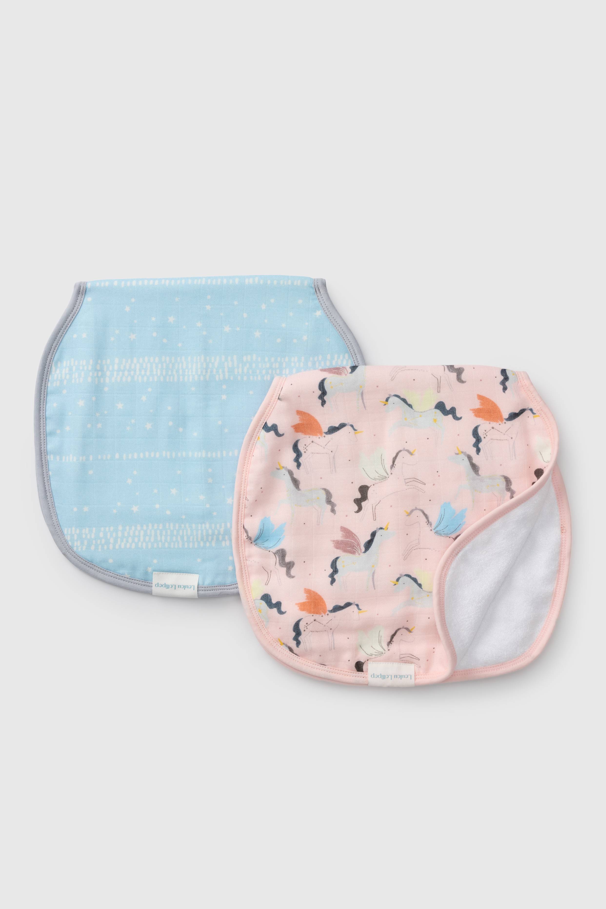 Soft, snuggly, and ready for any mess. Our two-piece burp cloth set is made from buttery-soft muslin with a super absorbent terry cloth back, perfect for catching spit-up, dribbles, and surprise sneezes.