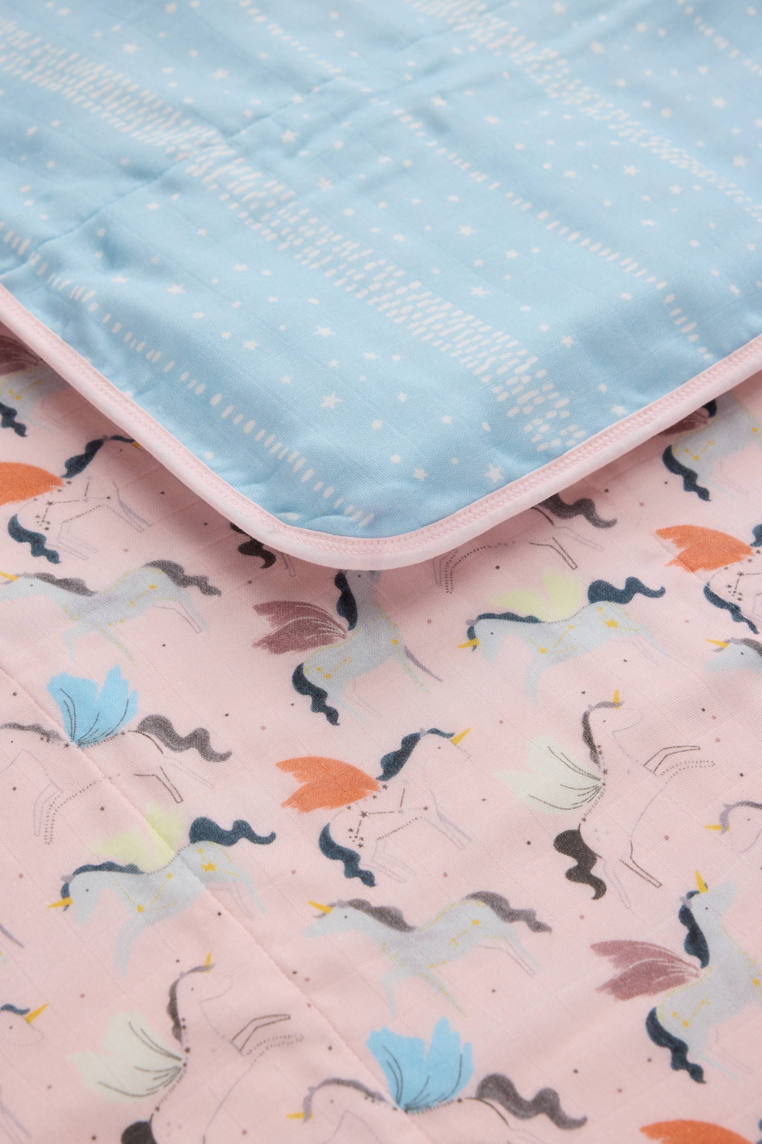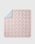 Our muslin quilts made from four layers of bamboo and cotton muslin fabric offer the perfect amount of breathable warmth and coziness to keep the baby comfortable and relaxed. This large reversible blanket is lightly quilted and features hand-drawn watercolor prints.
