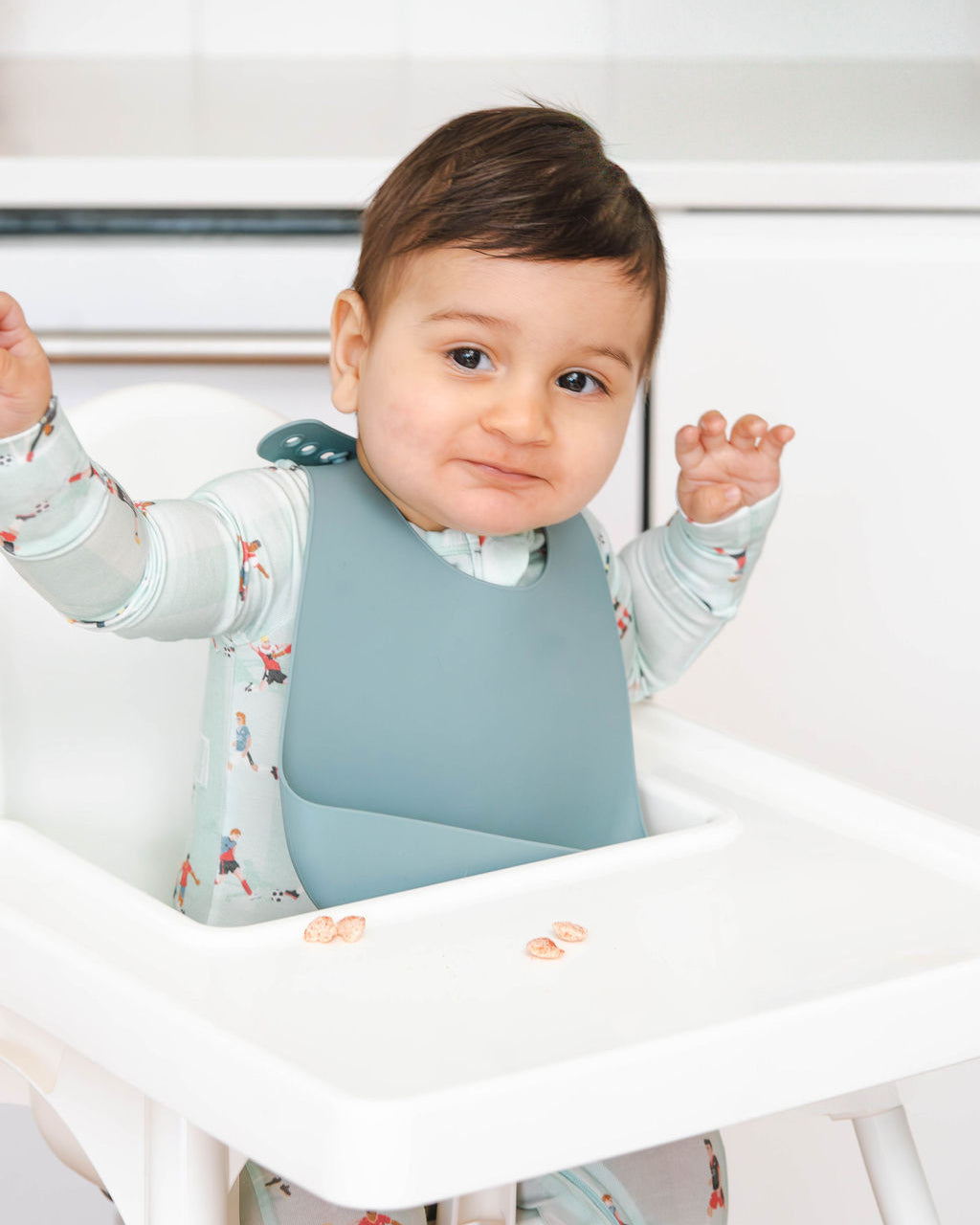 Make feeding time simpler with our range of soft, waterproof silicone baby bibs designed to catch crumbs, spills, and dribbles with a wide molded pouch that sits below the high chair tray. Adjustable buttonhole closures give a secure fit as baby grows, so these bibs are ideal from early solids through toddler years.