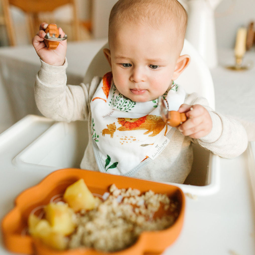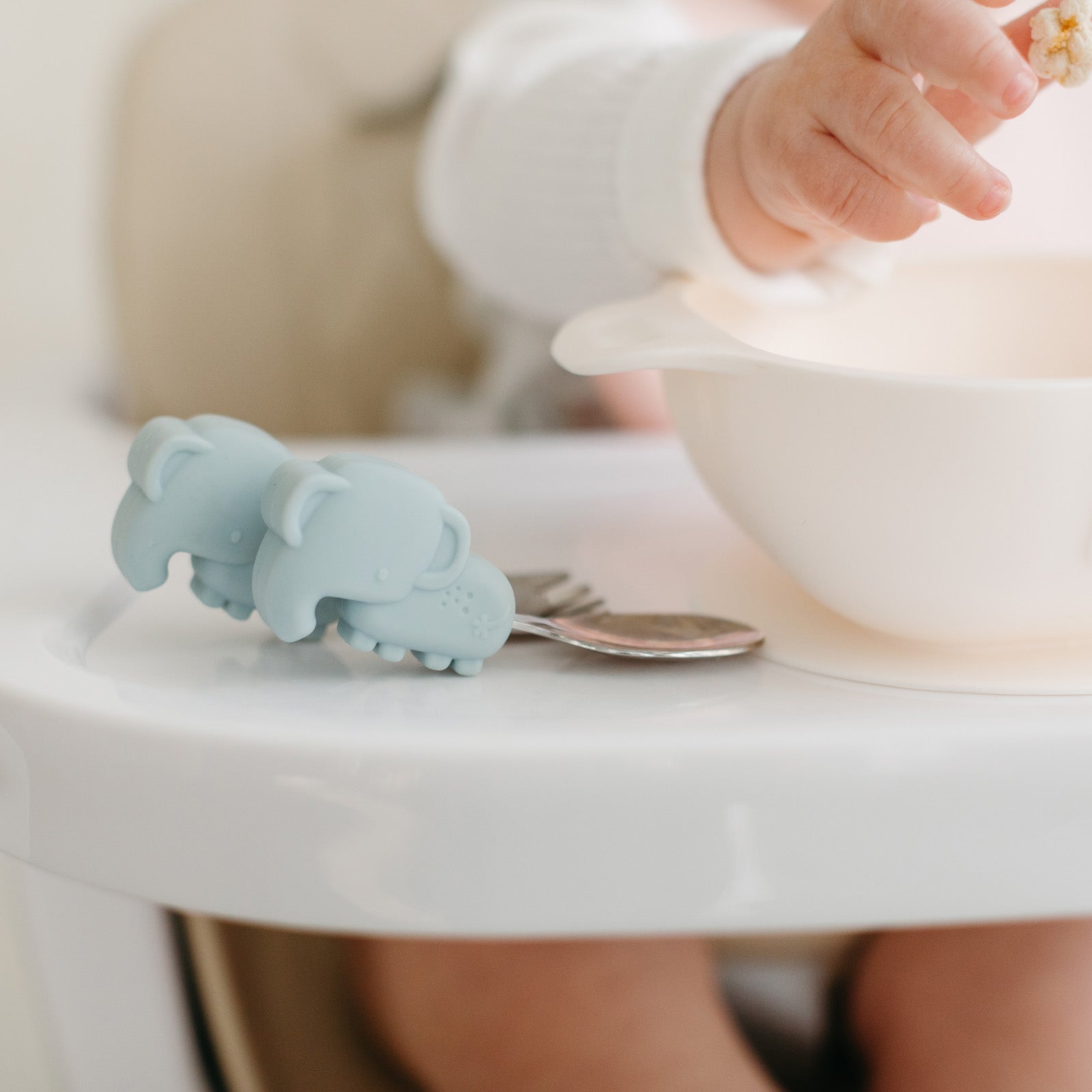 Our toddler spoon and fork set is made for self-feeding, with chunky, easy-grab handles that help little hands learn to scoop, stab, and snack all on their own (so less food ends up on the floor!). Crafted from buttery-soft, food-grade silicone and durable stainless steel, and topped with our adorable animal characters, they're the perfect mix of safe, functional, and fun.