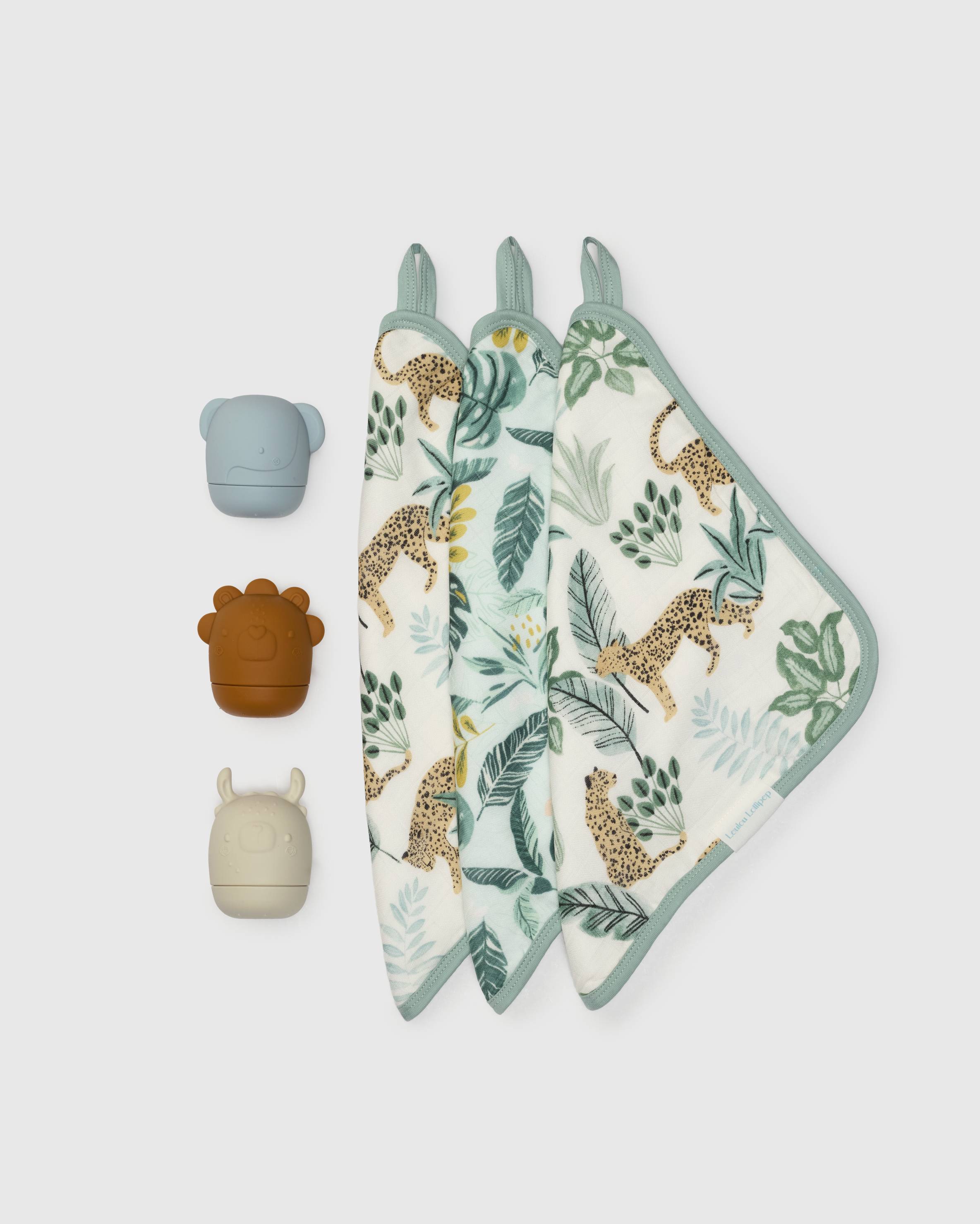 Scrub a dub dub, let’s go wild in the tub! This jungle animal-themed bath set is perfectly sized for tiny hands to squeeze and squirt. The toys open for easy cleaning to prevent mildew. For kids 12M+. Our Jungle Friends washcloth set features a snuggly soft terry cloth lining, making washing even the squirmiest faces possible. They’re OEKO-TEX® STANDARD 100 certified and safe for delicate skin.