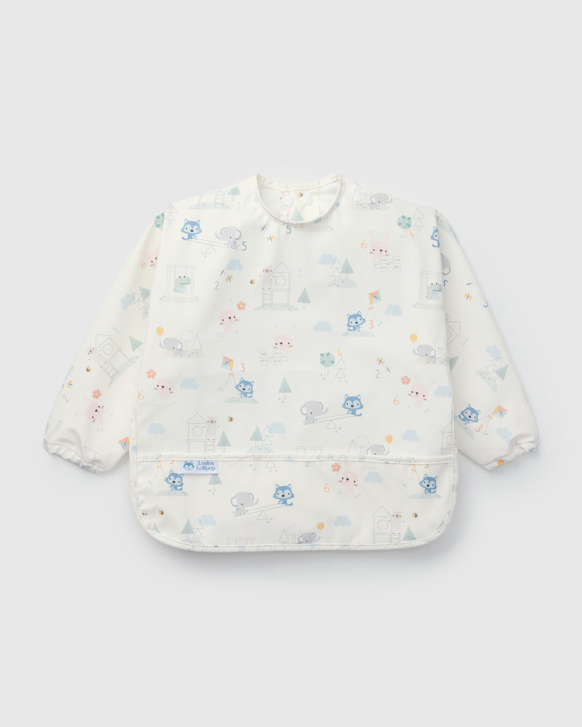 Hate doing extra laundry? Well, this full-coverage bib just became your saving grace. Our long sleeve waterproof bib is made with 100% responsibly sourced recycled polyester with TPU coating that is waterproof, stain, and odor resistant. Standard 100 by Oeko-tex certified. Designed with an adjustable neckline with snaps and elasticized cuffs allow for a comfortable fit that grows with baby to toddler from 6 months to 3 years old.