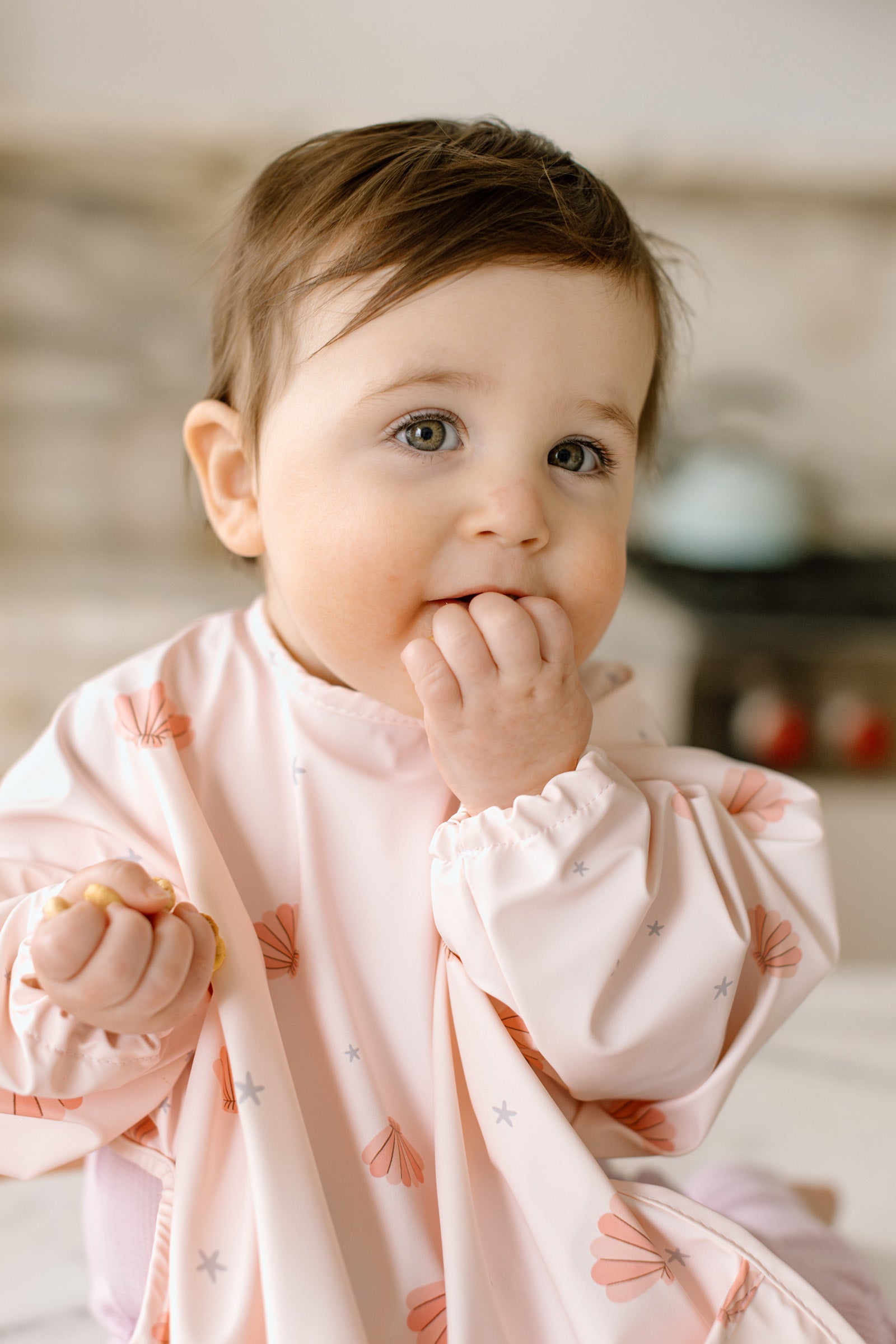 Hate doing extra laundry? Well, this full-coverage bib just became your saving grace. Our long sleeve waterproof bib is made with 100% responsibly sourced recycled polyester with TPU coating that is waterproof, stain, and odor resistant. Standard 100 by Oeko-tex certified. Designed with an adjustable neckline with snaps and elasticized cuffs allow for a comfortable fit that grows with baby to toddler from 6 months to 3 years old.