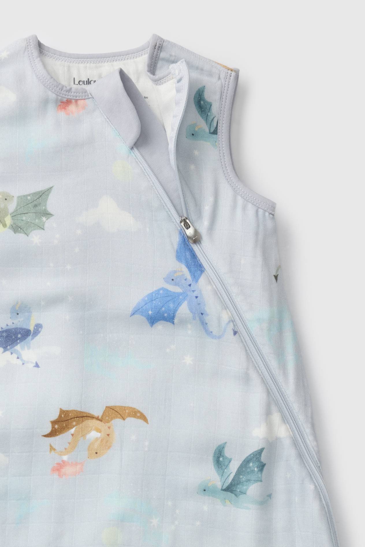 Lightweight enough to prevent overheating, secure enough to replace loose blankets — the Loulou Lollipop 0.5 TOG Muslin Sleep Bag in Magical Dragons keeps baby safe and cool on warm nights.