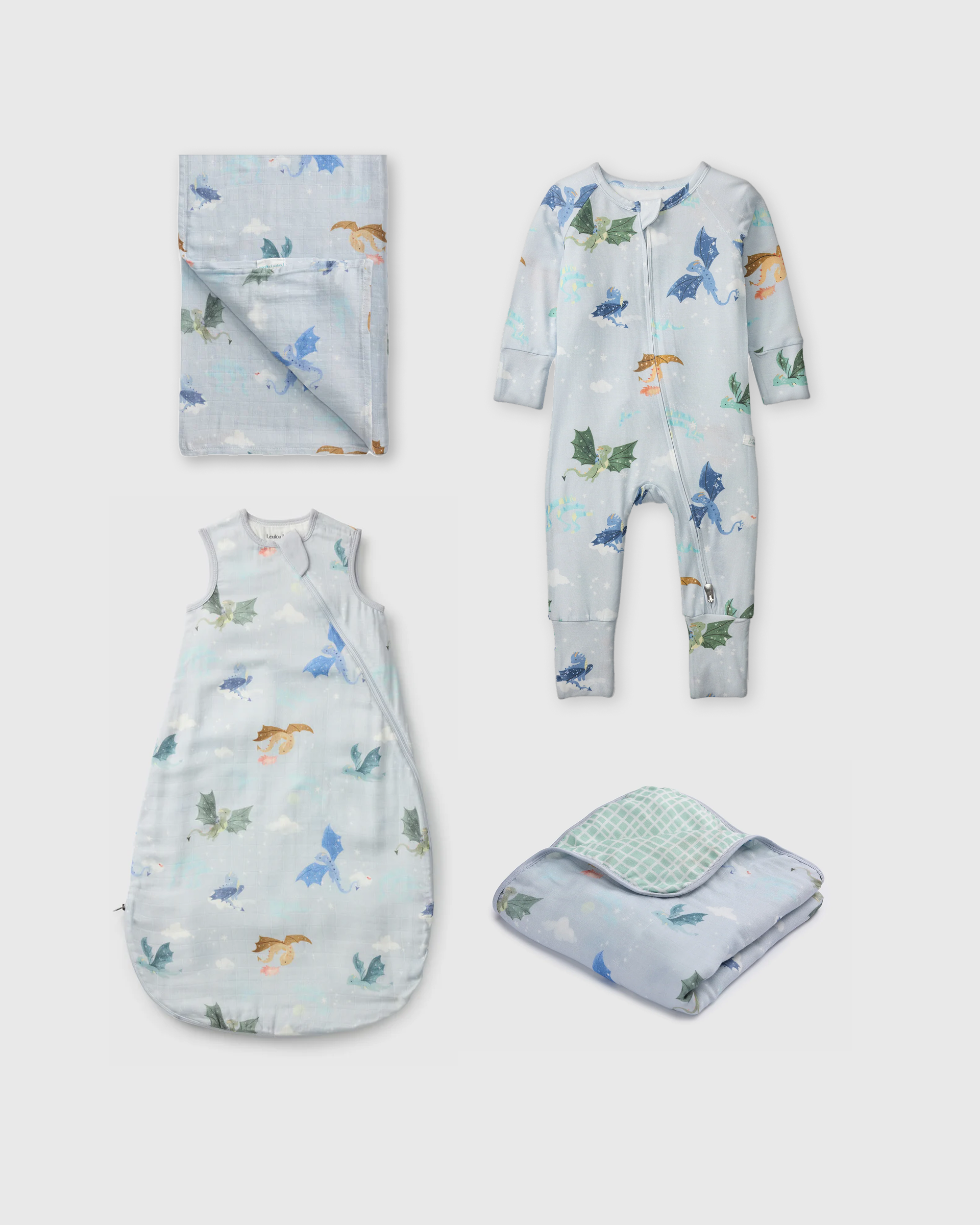 Settle your little one into cozy slumber with our Magical Dragons Newborn Sleep Bundle! This enchanting set includes a lightweight 0.5 TOG muslin sleep bag for breathable comfort, paired with our ultra-soft TENCEL™ sleeper made from sustainable fibers gentle on delicate skin. The versatile muslin swaddle is perfect for wrapping, cuddling, or on-the-go comfort, while the four-layer muslin quilt adds extra softness and warmth for naps, tummy time, or stroller rides.