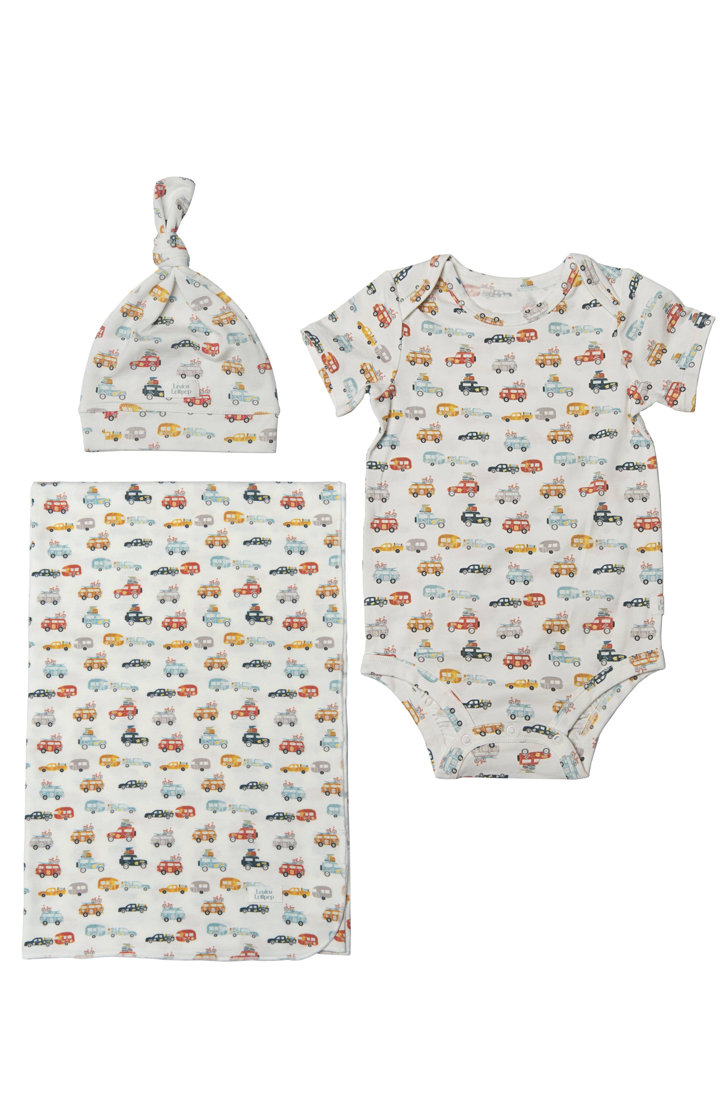 The gender-neutral newborn set includes one bodysuit, top knot beanie, and stretch knit blanket.